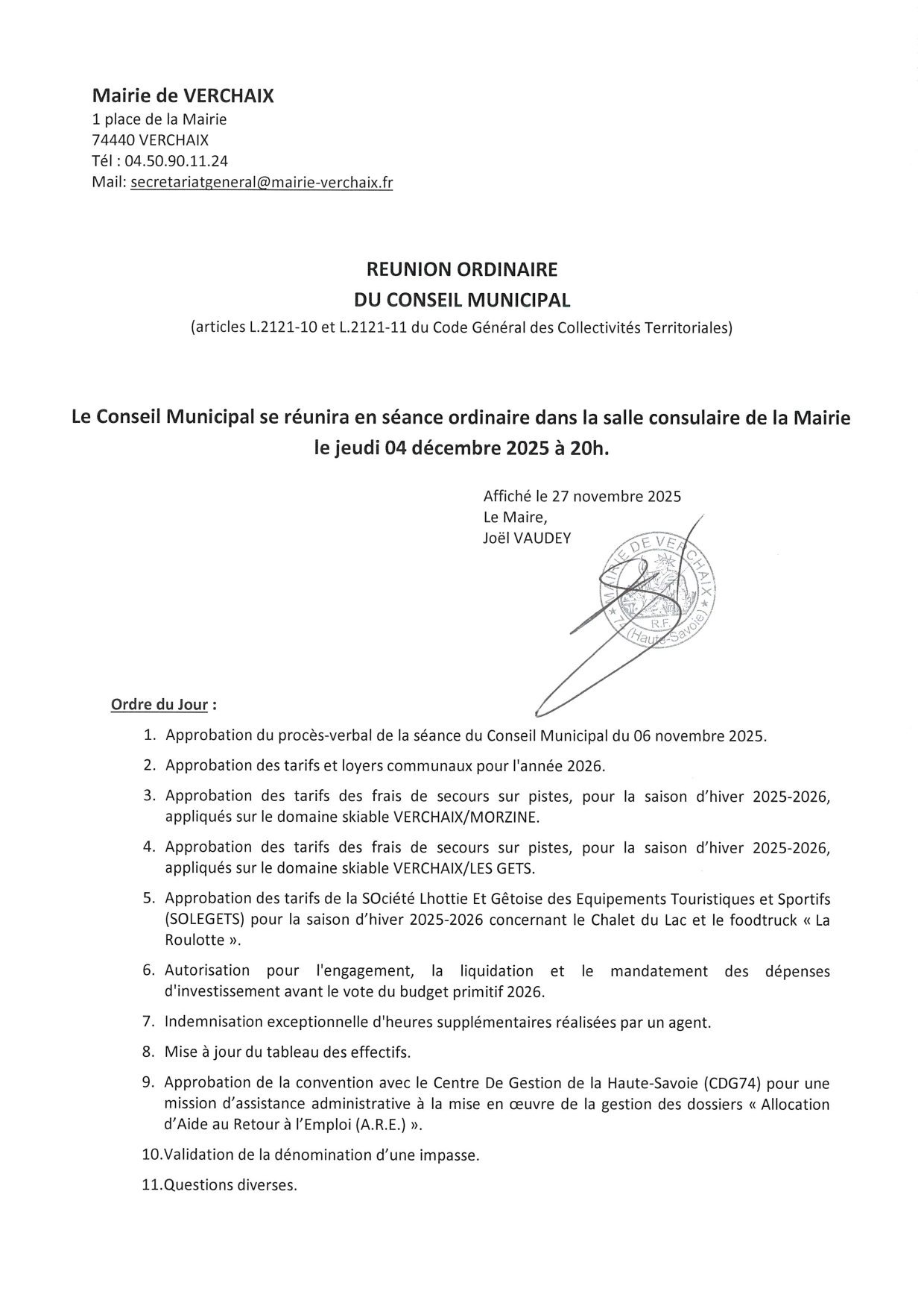 Publié le 27 novembre 202527 novembre 2025Prochain Conseil Municipal : jeudi 04 décembre 2025 Le Conseil Municipal se réunira jeudi 04 décembre 2025 à 20h à la mairie. Voici l’ordre du jour :