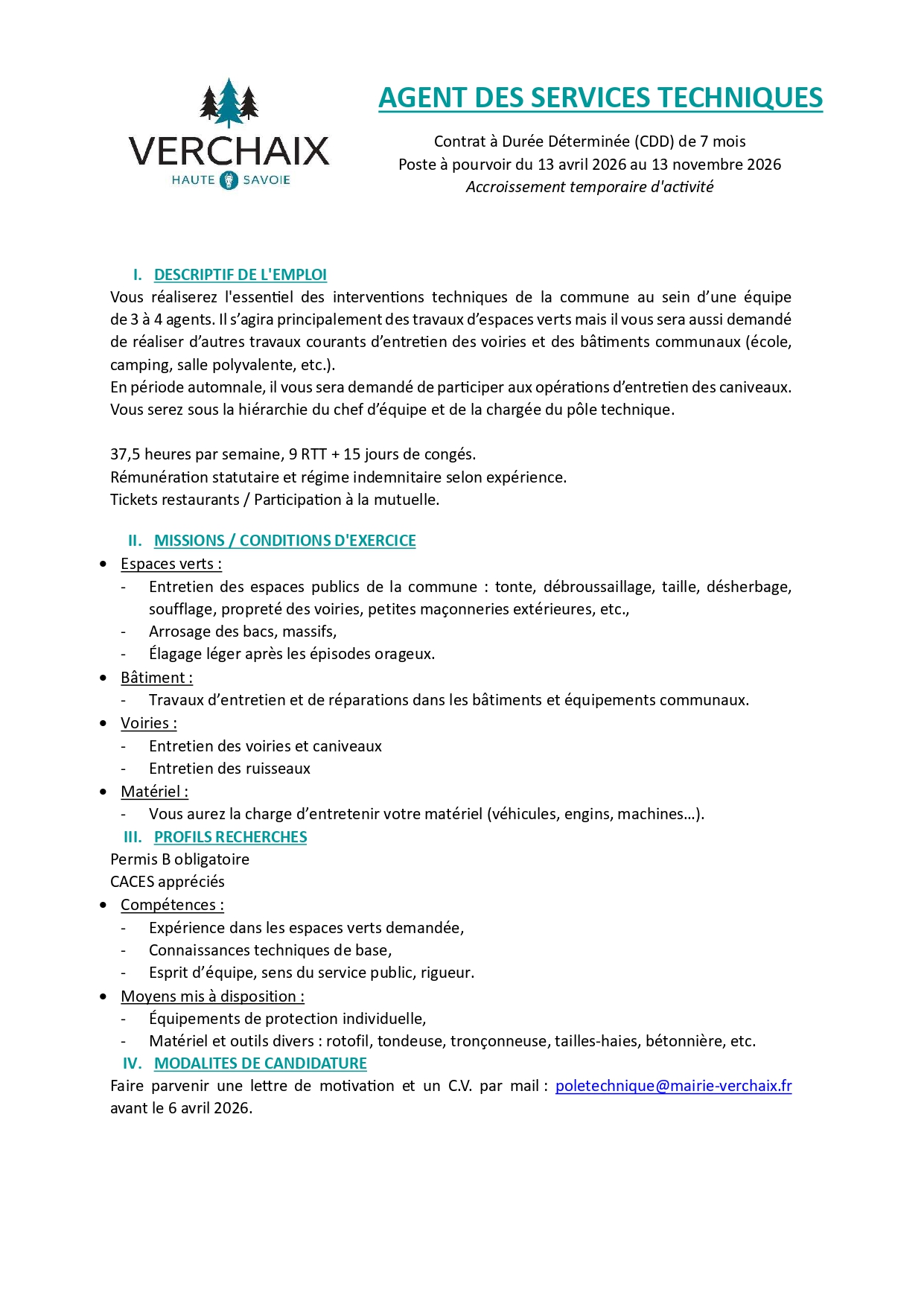 URGENT – EMPLOI – La Commune de Verchaix recrute un(e) agent des services techniques