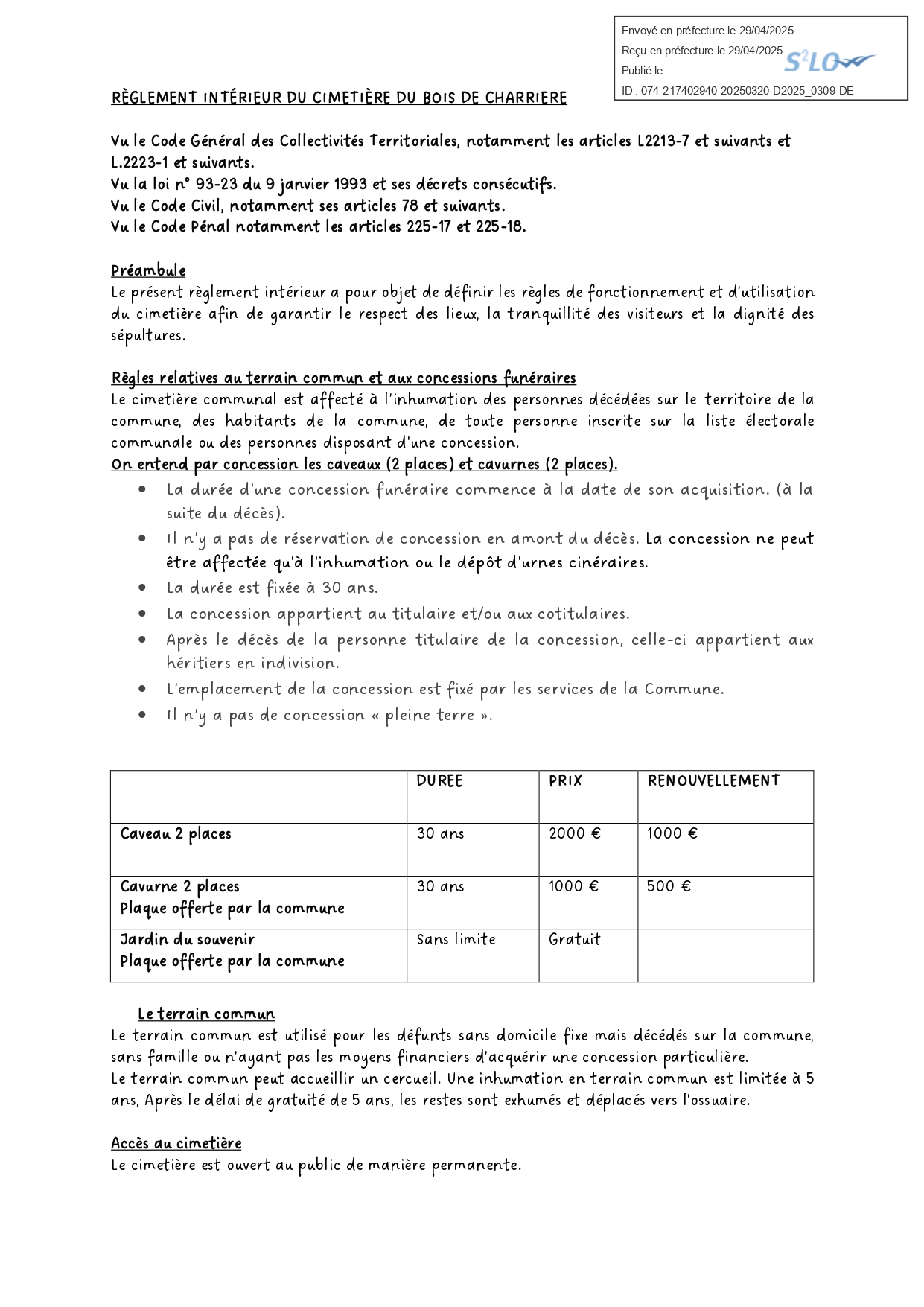 - Caveau 2 places – 30 ans : 2000 € / Renouvellement- 1000€